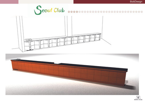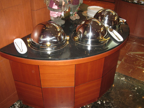 Buffet Counters with Wheels, Black Marble with Wood Doors & Storage below.